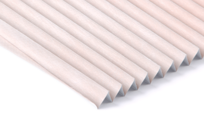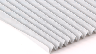 Táto Plisé látka je na dotyk skôr papierová, ale pevná. Má žíhaný vzhľad a na zadnej strane je potiahnutá bielou zatemňujúcou vrstvou.