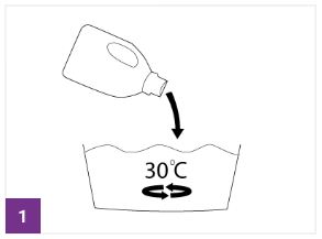 ![]() Do vody s teplotou 30 °C pridajte štandardný prací prostriedok na bielizeň a rozmiešajte.